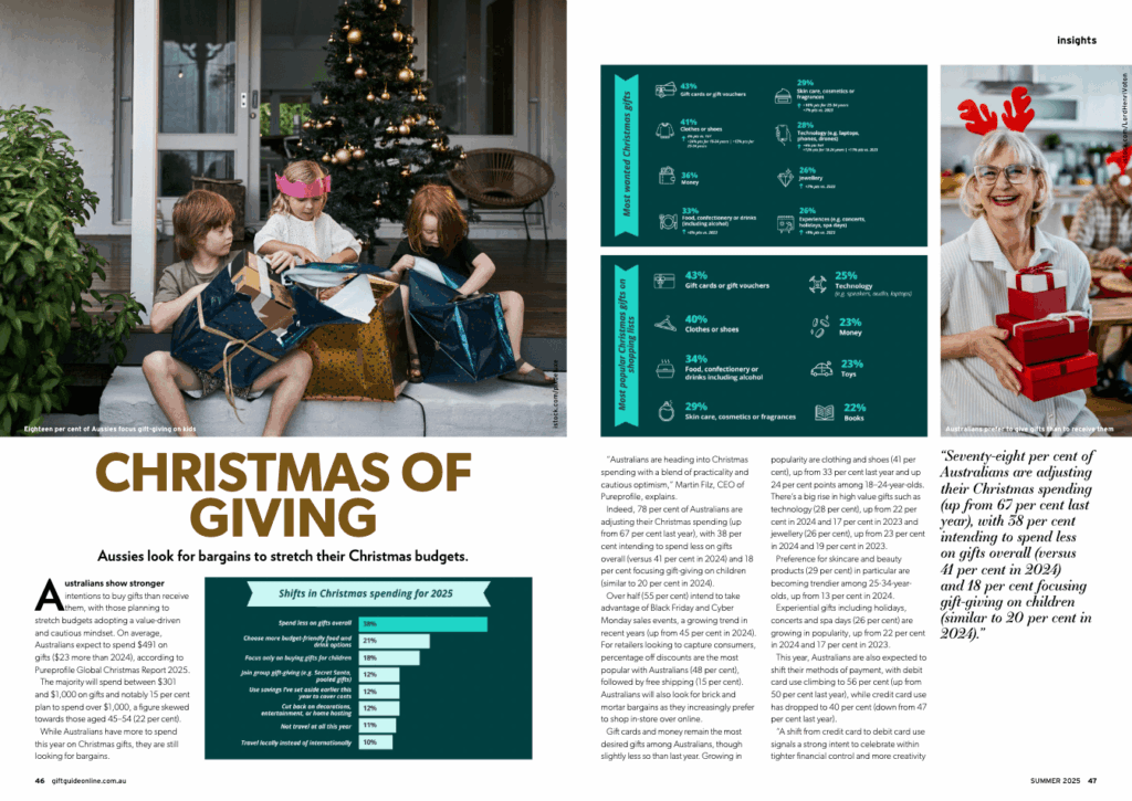 “Australians are heading into Christmas spending with a blend of practicality and cautious optimism,” Martin Filz, CEO of Pureprofile explains.