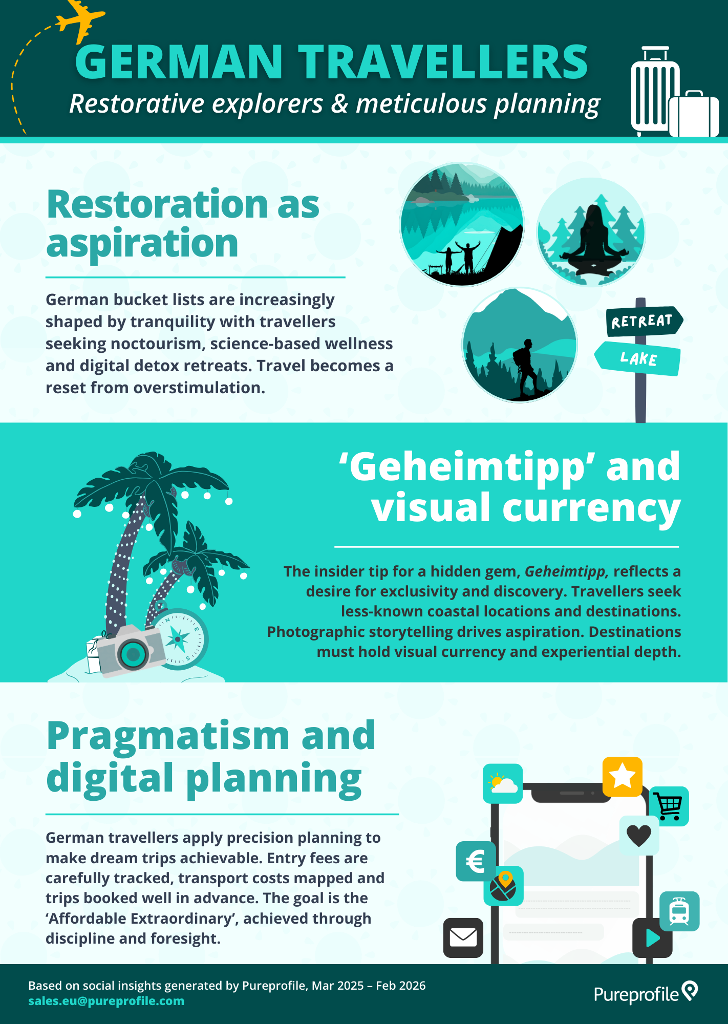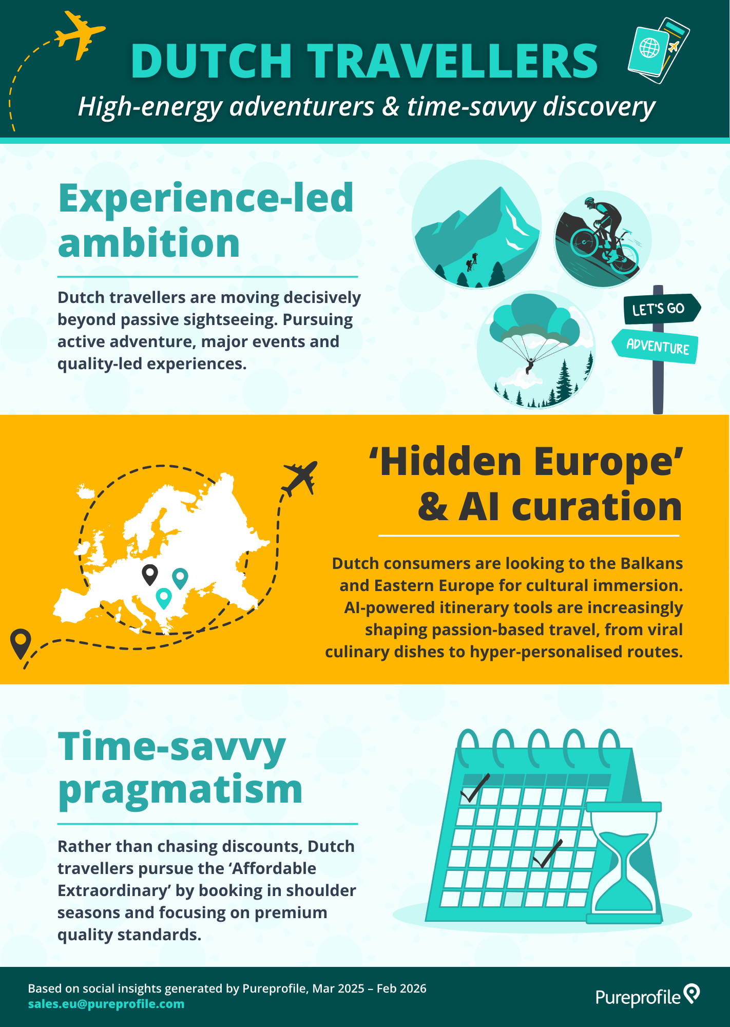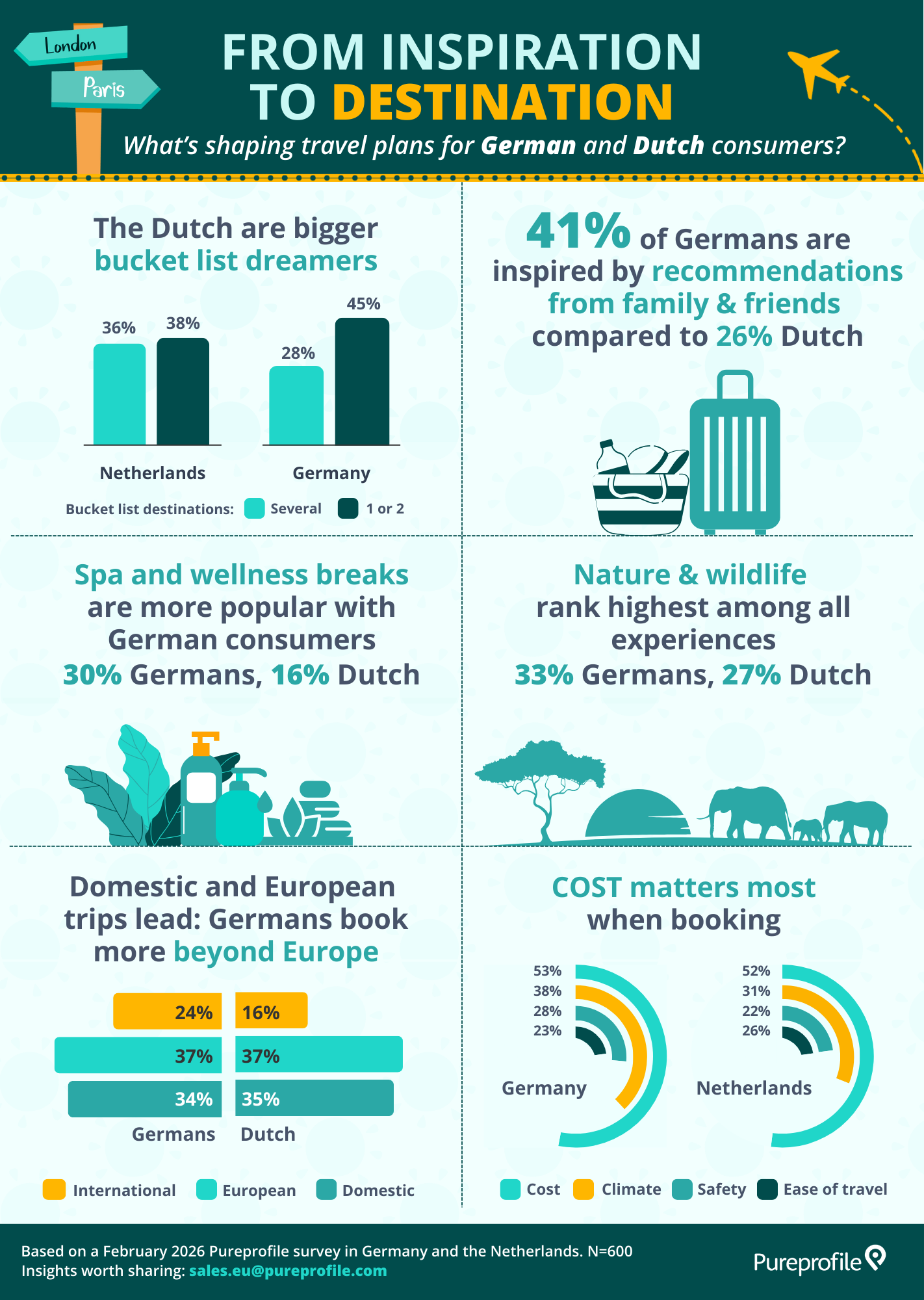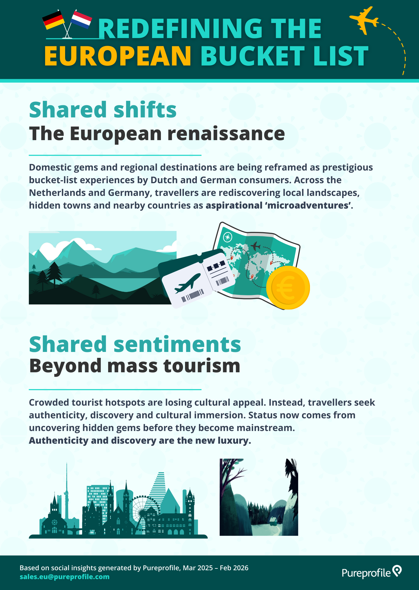 To understand these shifts, Pureprofile surveyed 600 consumers across Germany and the Netherlands. Alongside this survey, we analysed social conversations about travel over the past 12 months to uncover the motivations and cultural signals shaping travel inspiration and discovery through the holiday booking journey.
